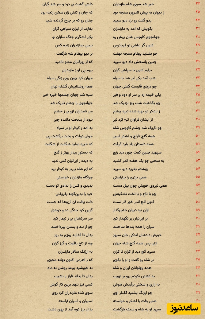 پادشاه کاووس پس از آمادهسازی سپاهش به همراه جنگآوران ایرانی به سمت مازندران حرکت کرد. او کلید گنجها و تخت پادشاهی را به میلاد سپرد و به او دستور داد که اگر دشمنی پدیدار شد، باید شجاعانه با او بجنگد. وقتی سپاه به کوه اسپروز رسید، کاووس و پهلوانانش برای استراحت در محلی مناسب و دور از دید قرار گرفتند. آنها شب را با بزم و شادی گذراندند. صبح روز بعد، همه پهلوانان به حضور شاه آمدند و گیو از میان لشکر هزار نفر جنگجوی دلاور را انتخاب کرد تا به شهر مازندران حمله کنند. گیو به همراه گزیدگان لشکر به شهر مازندران حمله کرد و هر چه را که در مسیرشان بود غارت و تخریب کردند. وقتی خبر این حملات به شاه مازندران رسید، او نگران و خشمگین شد. سپهسالاری به نام سنجه به سرپرستی دیو سپید رفت و اوضاع را گزارش داد. دیو سپید قول داد که با لشکری بزرگ به مازندران برود و ایرانیان را شکست دهد. شب هنگام سپاه دیوان با ابرهای سیاه به مازندران رسید و ایرانیان به دام افتادند. چشم بسیاری از آنان تیره و خسته شد و سپاهش شکست خورد و در نهایت اسیر شدند. شاه کاووس و پهلوانان ایرانی در بند گرفتار گشتند و دیو سپید تمامی گنجها را به ارژنگ، فرمانده مازندران سپرد. ارژنگ به سمت شاه مازندران رفت و خبر پیروزی را رساند. دیو سپید با اینکه میتوانست شاه و پهلوانان ایرانی را بکشد، تصمیم گرفت تا آنها را به زنجیر بکشد و اندکی خوراک به آنها دهد تا بدانند در چه وضعیت بغرنجی قرار گرفتهاند.