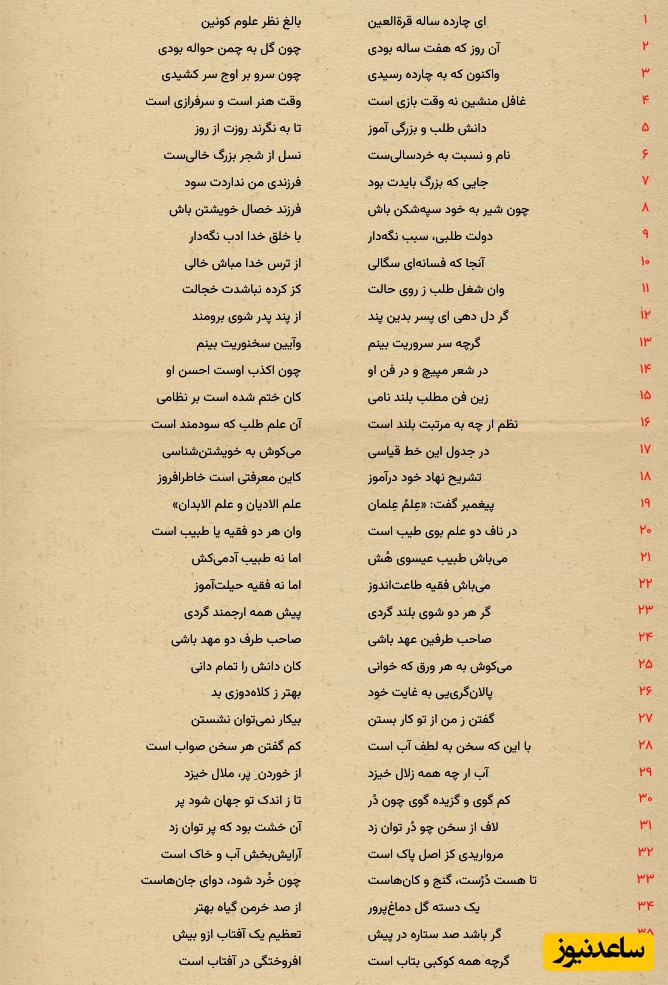 این شعر دربارهی فرزند نوجوانی است که در سن چهاردسالگی به مرحلهای از بلوغ علمی و اخلاقی رسیده است. شاعر به او توصیه میکند که به جای وقتگذرانی و بازی، باید به دنبال علم و هنر باشد و در تلاش برای کسب دانش و بزرگترین صفات انسانی باشد. او همچنین به اهمیت ادب و احترام به دیگران اشاره میکند و نقش علم و دانش را در زندگیاش برجسته میسازد. در نهایت، تأکید میکند که در دنیای علم و ادب، کیفیت بر کمیت ارجحیت دارد و درک عمیق و خردورزی باعث میشود که فرد به مقام بلندتری دست یابد. شاعر میگوید که در زندگی باید از صدرنشینان علم و اخلاق باشی و به نوعی خود را از دیگران متمایز کنی.