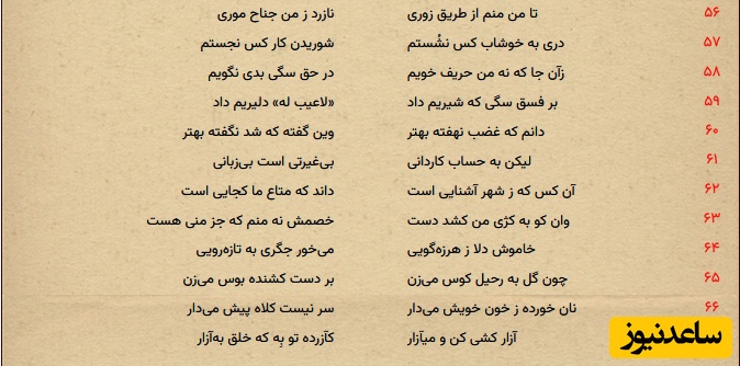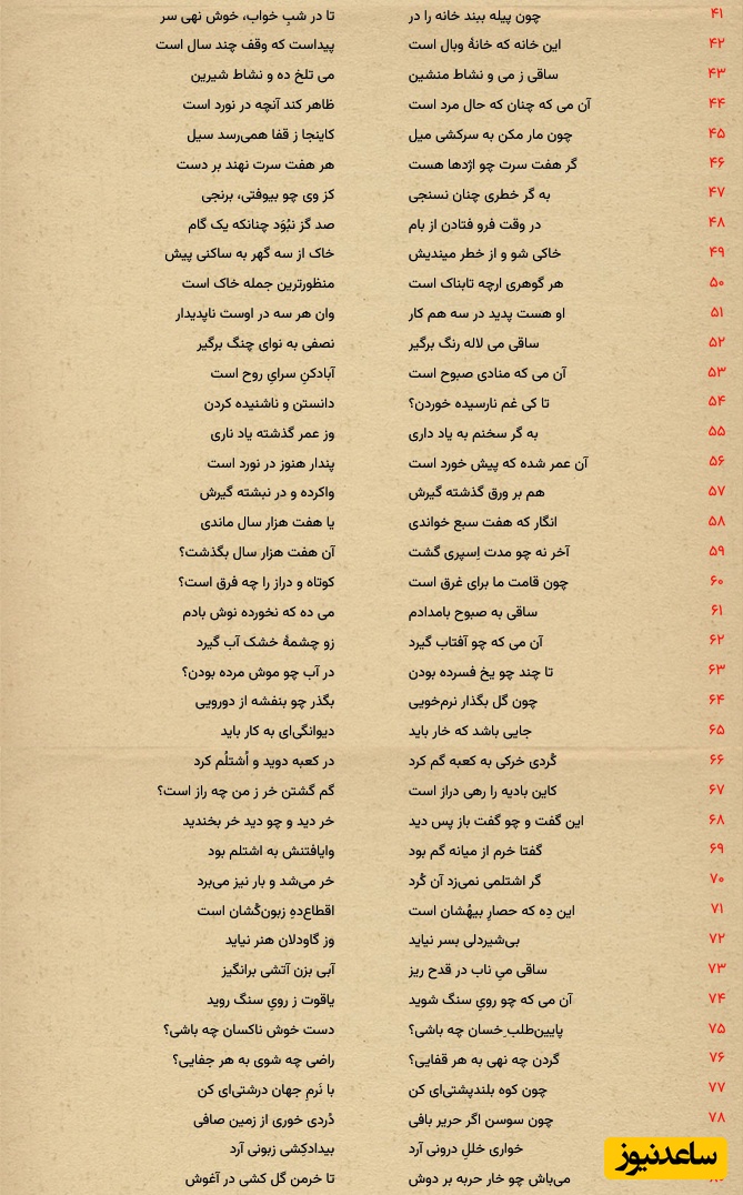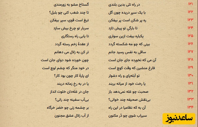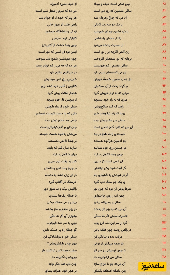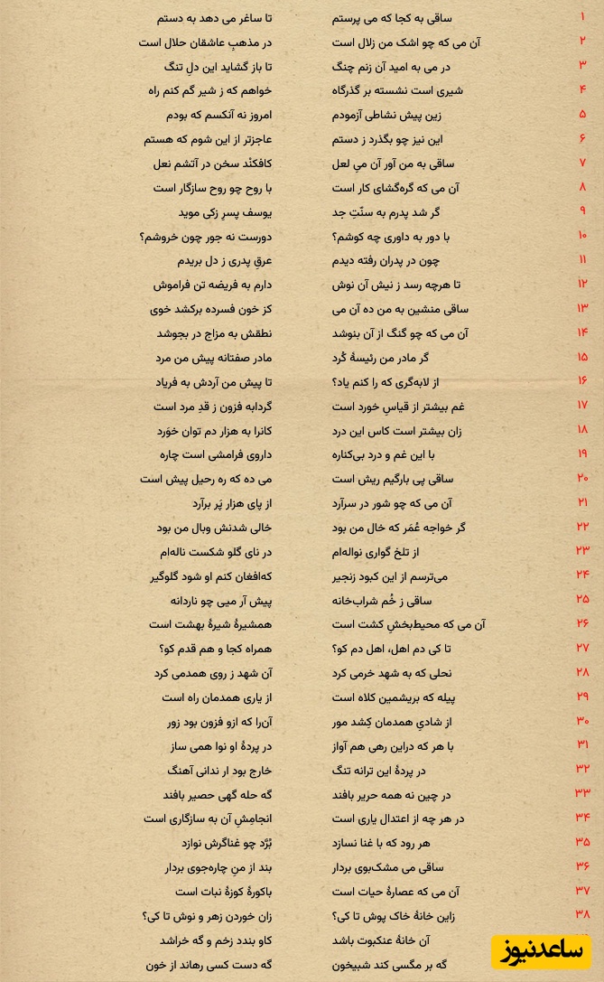 شاعر در این شعر، از ساقی میخواهد که بادهای بهاو بدهد که دل غمگین او را شاد کند و سپس گویی از آنچه که دلش را غمگین ساخته سخن گفتهباشد از درگذشتگان و خویشان خود یاد میکند. با یادآوردن درگذشتگان و رفتگان، غم بیشتر شاعر را فرامیگیرد و از ساقی باده بیشتر و پیاپی طلب میکند. شاعر در ادامه از اهمیت داشتن یار و دوست در سفر زندگی میگوید و از اینکه آدمی باید توانایی هماهنگی با یاران را در خود تقویت نماید و در این زمینه مثالهایی از طبیعت و موسیقی میآورد. او از بیوفایی دنیا میگوید و از ساقی میخواهد که بادهای بریزد که نشاطافزا باشد. در این شعر از اهمیت تواضع و فروتنی گفته شده است اما توصیه شده که آدمی باید شجاع و دلیر باشد تا در اجتماع بتواند از حق خود دفاع کند زیرا حقوق انسانهای ترسو همیشه توسط آدمیان ظالم پایمال میشود. شاعر در ادامه بهدوری از صحبت و همنشینی حاکمان و پادشاهان پند داده و اینکه آدمی باید از طمع و چشمدوختن به دارایی دیگران بپرهیزد زیرا کسی که بیش از رزق خود بخواهد، دچار بداقبالی خواهد شد.