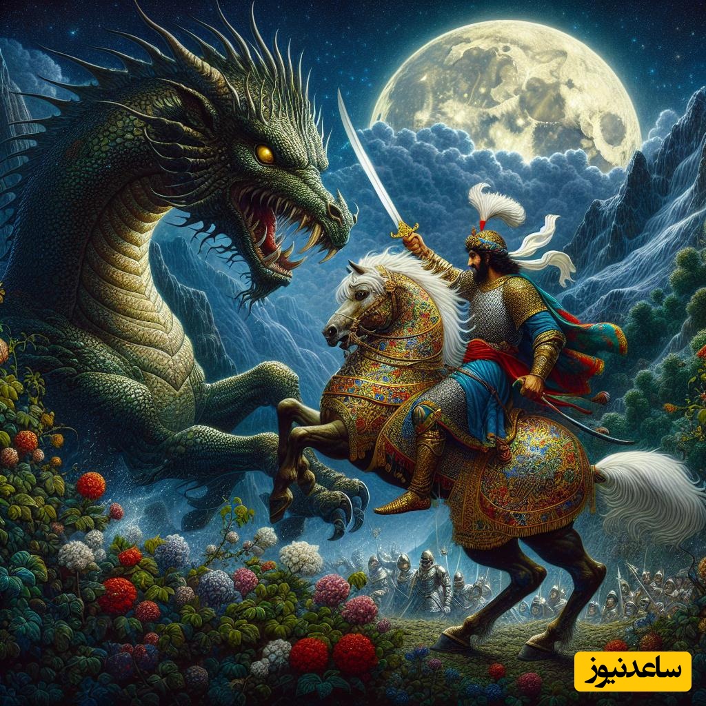 در سرزمین مازندران، هیولایی به شکل اژدها زندگی میکرد که باعث ترس و وحشت تمامی موجودات شده بود. هیچکس جرأت نزدیک شدن به محل زندگیاش را نداشت. روزی اژدها به نزدیکی محل خواب رستم آمد و رخش، اسب وفادار رستم، متوجه حضور اژدها شد و با سم خود به زمین کوبیده و رستم را بیدار کرد. رستم که نمیدانست چه خطری در کمین اوست، بر سر رخش خشمگین شد که چرا او را از خواب بیدار کرده است. دوباره رستم به خواب رفت و این بار نیز اژدها از تاریکی شب استفاده کرد و به رستم نزدیک شد، اما باز رخش با لگد زدن به زمین و خروشیدن، رستم را بیدار کرد. رستم دوباره از دست رخش خشمگین شد. بار سوم اژدها برای حمله به رستم نزدیک شد و رخش با تمام توان تلاش کرد تا رستم را از خطر آگاه کند. در نهایت، رستم از خواب بیدار شد و متوجه حضور اژدها گردید. با شمشیر خود به مقابله با اژدها پرداخت و با کمک رخش شجاع، که با دندانهای خود کتف اژدها را گرفت، موفق به کشتن اژدها شد. پس از پیروزی، رستم خداوند را شکر کرد که به او قدرت و دلیری داده تا بتواند این موجود ترسناک را شکست دهد. او به قدرت الهی ایمان داشت که با کمک آن توانست اهداف خود را در این دنیای پر از خطر و دشمنان بیشمار دنبال کند.