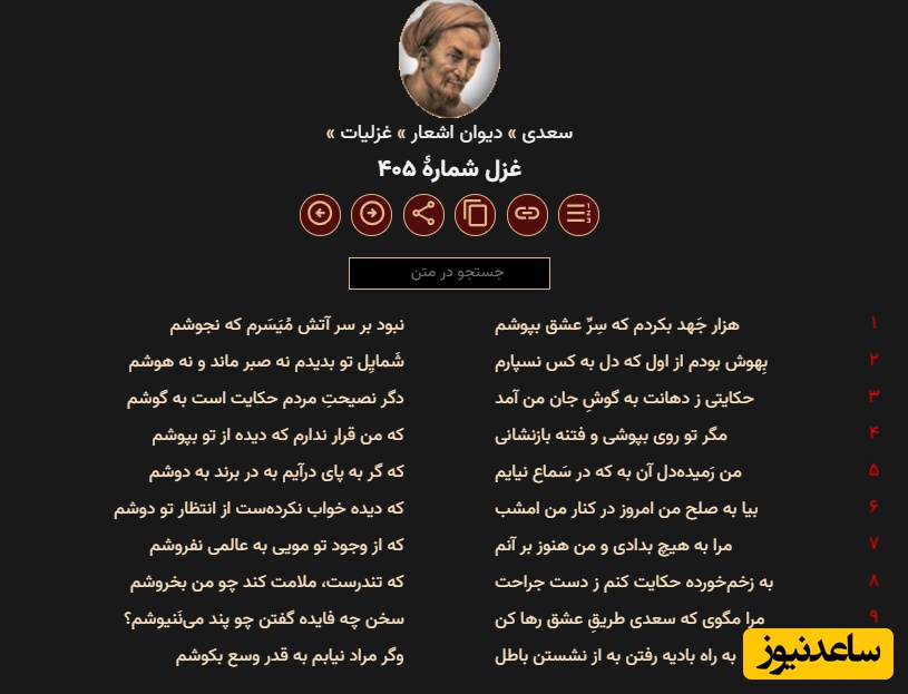 به گزارش سرویس مجله خانواده ساعدنیوز، سعدی شیرازی شاعر و نویسنده بزرگ ایرانی قرن هفتم هجری قمری است. عاشقان غزل و عرفان از آثار این شاعر بزرگ بسیار بهره بردهاند.