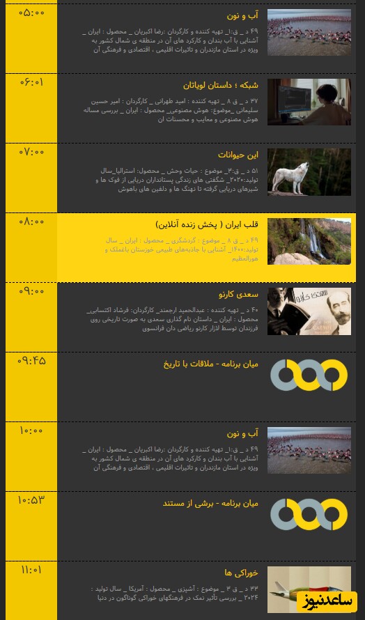 06:08 | صبح بخیر ایران [زنده] مدت برنامه 105 دقیقه - اسماعیل آذر استاد ادبیات زبان فارسی - بهرام شکوری رس اتاق معدن - سید امین هاشمی پلسکی دهیار روستای:پلسک از شهرستان:ساری ( تلفنی ) - علیرضا نیکوئی مدیرکل اقتصادی سازمان تات - بردیا فرزام فر مدیرعامل این شرکت دانش بنیان مدوک زیست دارو - موضوع برنامه اجتماعی | 01:45:34 |