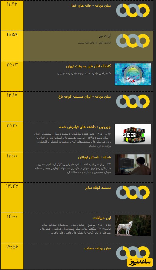 11:54 | میان برنامه مدت برنامه 9 دقیقه - شبکه یک شبکه هر ایرانی ، سایت ، www. tv1 . ir ، پیامک 300001 | 00:08:33 |