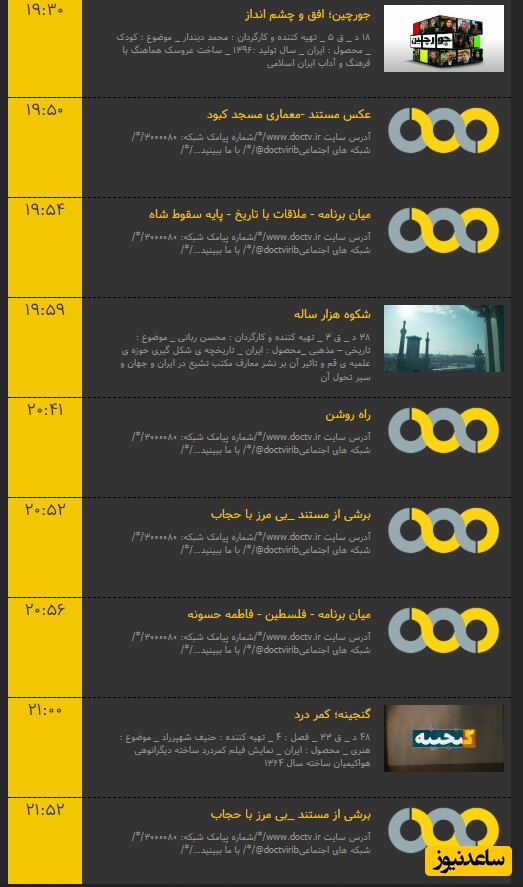 20:49 | میان برنامه مدت برنامه 10 دقیقه - شبکه یک شبکه هر ایرانی ، سایت ، www. tv1 . ir ، پیامک 300001 | 00:10:22 |