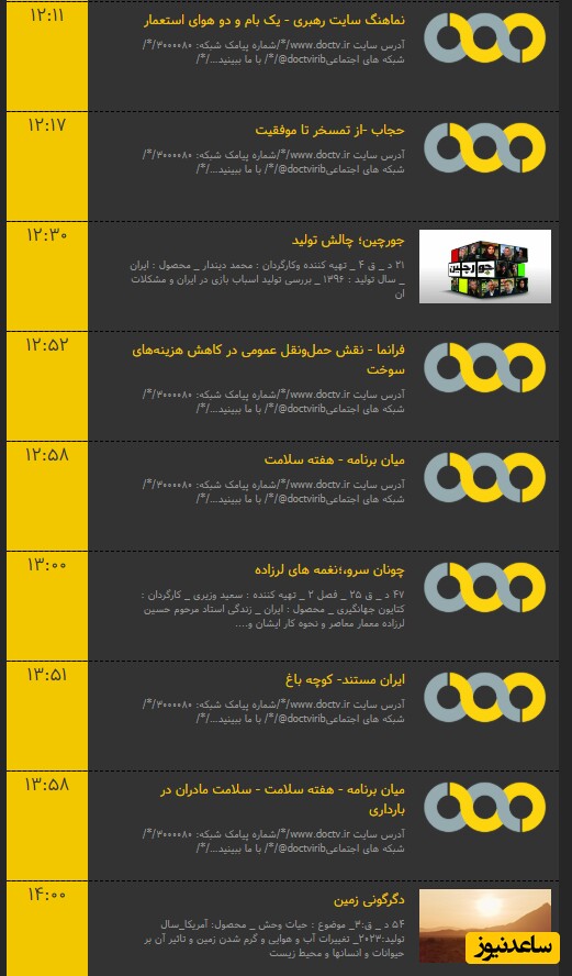 12:16 | میان برنامه مدت برنامه 6 دقیقه - شبکه یک شبکه هر ایرانی ، سایت ، www. tv1 . ir ، پیامک 300001 | 00:06:30 |