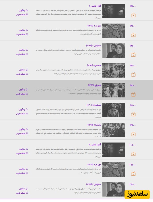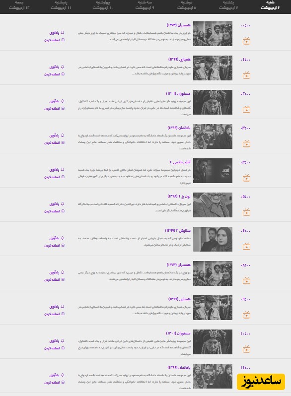 15:07 | مجموعه داستانی ناریا - قسمت ششم مدت : 44 دقیقه [قسمت] 6 [خلاصه برنامه] سامان اطلاعات کاملی درباره هوژان بدست می آورد بازپخش | 00:44:09 |