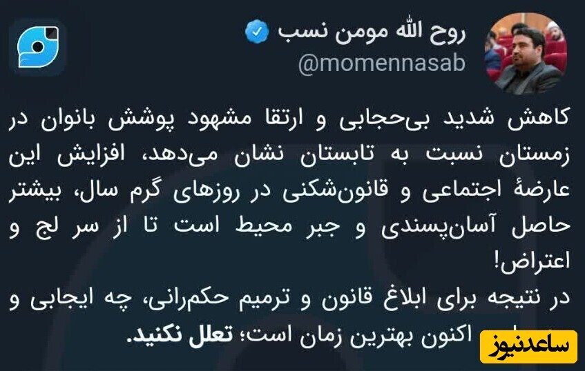 به گزارش پایگاه خبری ساعدنیوز، روحالله مومن نسب، دبیر ستاد امربهمعروف و نهیازمنکر استان تهران، با انتشار یادداشتی در فضای مجازی ضمن اشاره به پوشش متفاوت زنان در فصول گرم و سرد سال، به لزوم ابلاغ مصوبه حجاب پرداخته است. او در این زمینه نوشت: کاهش شدید بیحجابی و ارتقا مشهود پوشش بانوان در زمستان نسبت به تابستان نشان میدهد، افزایش این عارضهٔ اجتماعی و قانونشکنی در روزهای گرم سال، بیشتر حاصل آسانپسندی و جبر محیط است تا از سر لج و اعتراض! در نتیجه برای ابلاغ قانون و ترمیم حکمرانی، چه ایجابی و چه سلبی، اکنون بهترین زمان است؛ تعلل نکنید.