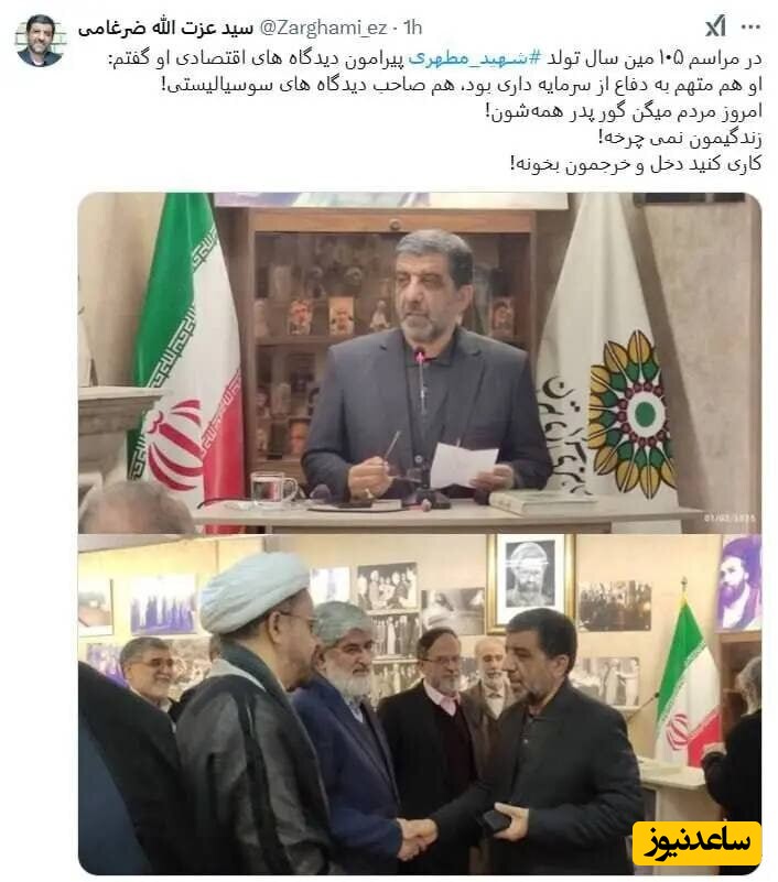 او در این زمینه نوشت: «در مراسم 105مین سال تولد شهید مطهری پیرامون دیدگاههای اقتصادی او گفتم: او هم متهم به دفاع از سرمایهداری بود، هم صاحب دیدگاههای سوسیالیستی! امروز مردم میگن گور پدر همهشون! زندگیمون نمیچرخه! کاری کنید دخل و خرجمون بخونه!»
