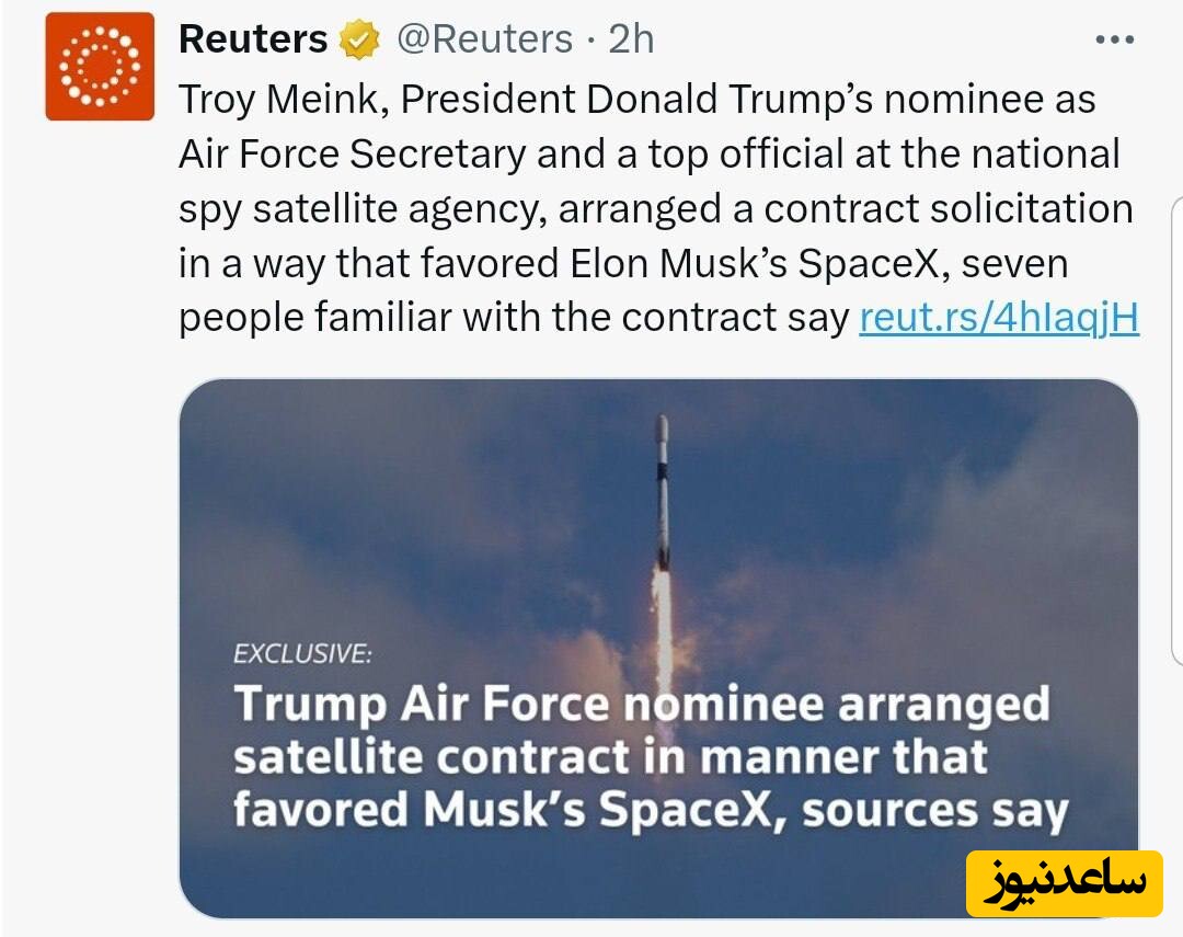 تورز مینک، نامزد ترامپ برای پست فرماندهی نیروی هوایی و امور ماهوارههای جاسوسی، قراردادی را در حوزه ماهواره با اسپیس ایکس به نفع ایلان ماسک بسته است