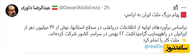 به گزارش سرویس سیاسی پایگاه خبری ساعدنیوز، عبدالرضا داوری در شبکه ایکس نوشت:
