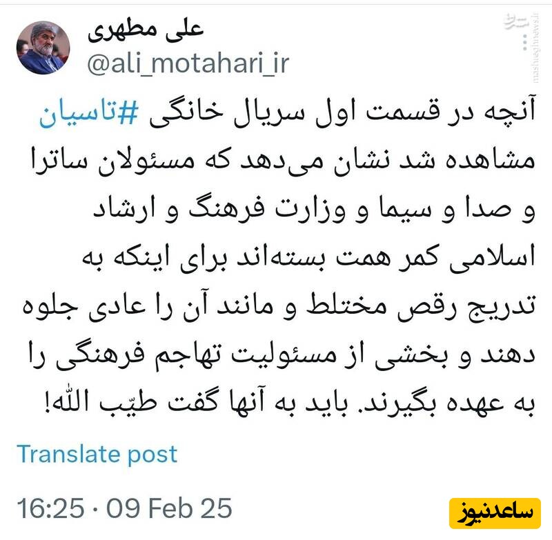 به گزارش سرویس سیاسی ساعدنیوز به نقل از مشرق، علی مطهری درباره قسمت نخست سریال تاسیان در شبکه اجتماعی ایکس نوشت : آنچه در قسمت اول سریال خانگی #تاسیان مشاهده شد نشان میدهد که مسئولان ساترا و صدا و سیما و وزارت فرهنگ و ارشاد اسلامی کمر همت بستهاند برای اینکه به تدریج رقص مختلط و مانند آن را عادی جلوه دهند و بخشی از مسئولیت تهاجم فرهنگی را به عهده بگیرند. باید به آنها گفت طیّب الله!
