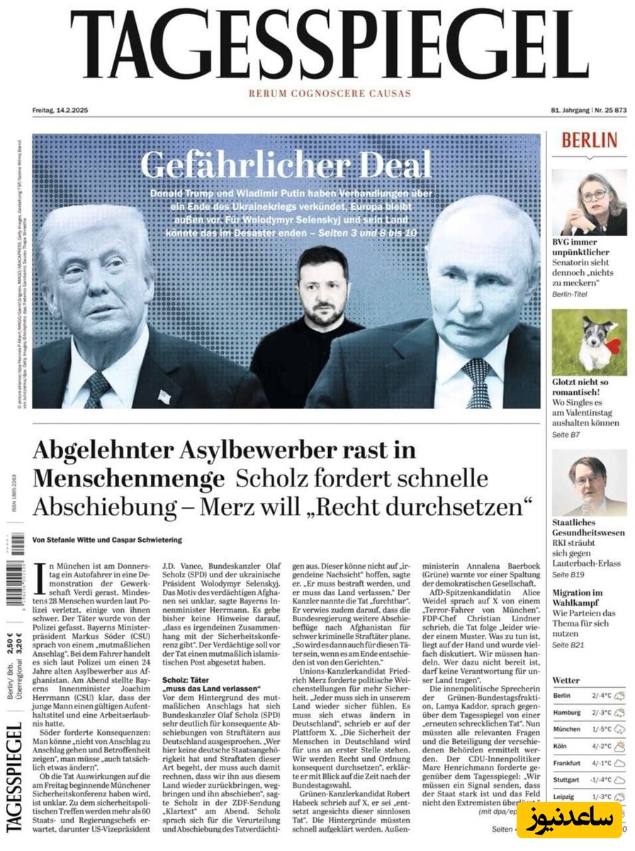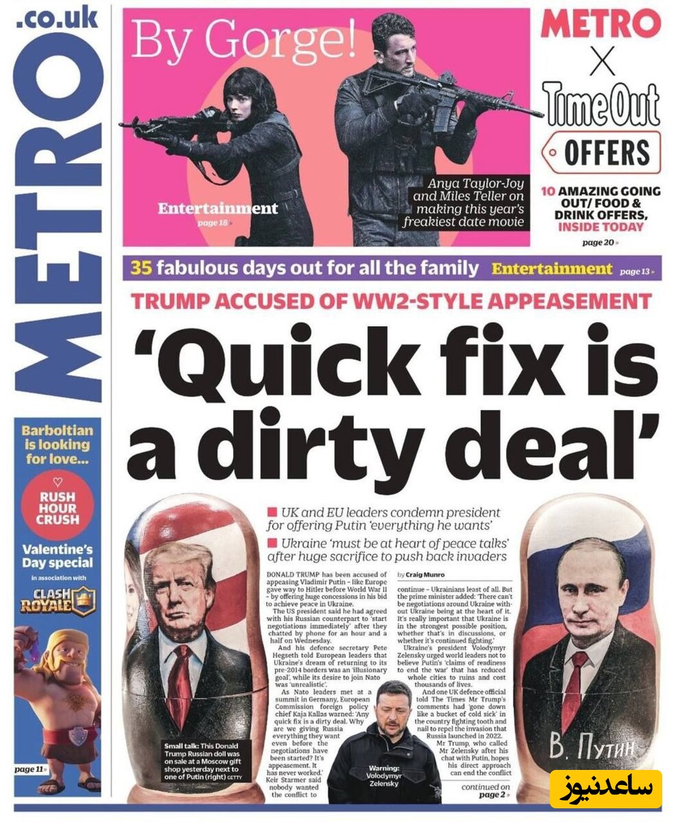 ساعدنیوز: بعد از مکالمه تلفنی پوتین و ترامپ و انتشار اخباری مبنی بر توافقات اولیه روسای جمهور آمریکا و روسیه بدون کشورهای اروپایی عضو ناتو و البته خود اوکراین، روزنامههای اروپایی با عصبانیت، ترامپ را به مماشات با پوتین در موضوع جنگ اوکراین متهم کردند که در ادامه تصاویر آن را میبینید.