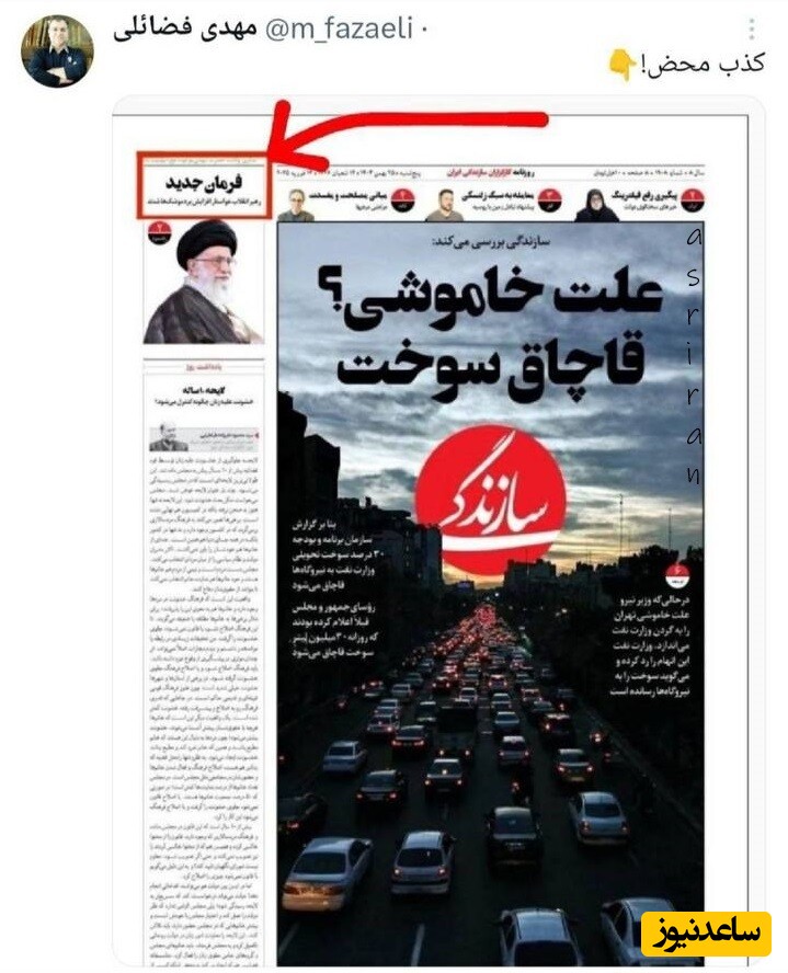 بنا به این گزارش؛ مهدی فضائلی، عضو دفتر حفظ و نشر آثار رهبری، با انتشار متنی در حساب کاربری خود در شبکه اجتماعی اکس با تاکید بر این تیتر در صفحه نخست روزنامه سازندگی نوشت: کذب محض!