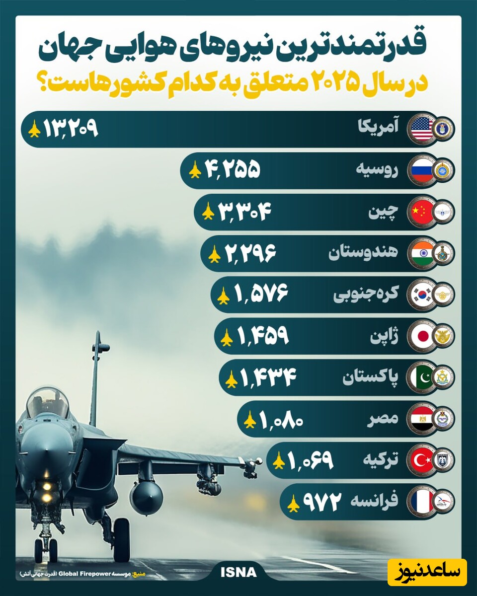 به گزارش پایگاه خبری ساعدنیوز، نیروی هوایی آمریکا از مجموع نیروهای هوایی روسیه، چین، هند، کره جنوبی و ژاپن بزرگتر است و حدود 40درصد از هزینههای نظامی جهان را به خود اختصاص داده و سالانه بیش از 800 میلیارد دلار هزینه میکند.