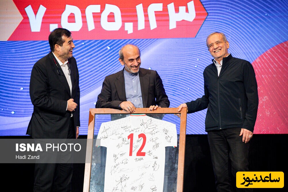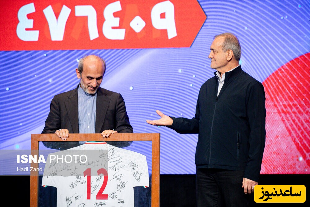 در ادامه تصاویری از اهدای پیراهن امضا شده تیم ملی فوتبال به مسعود پزشکیان، رئیس جمهور در مراسم اختتامیه جشنواره «قهرمان ایران» را مشاهده می کنید؛