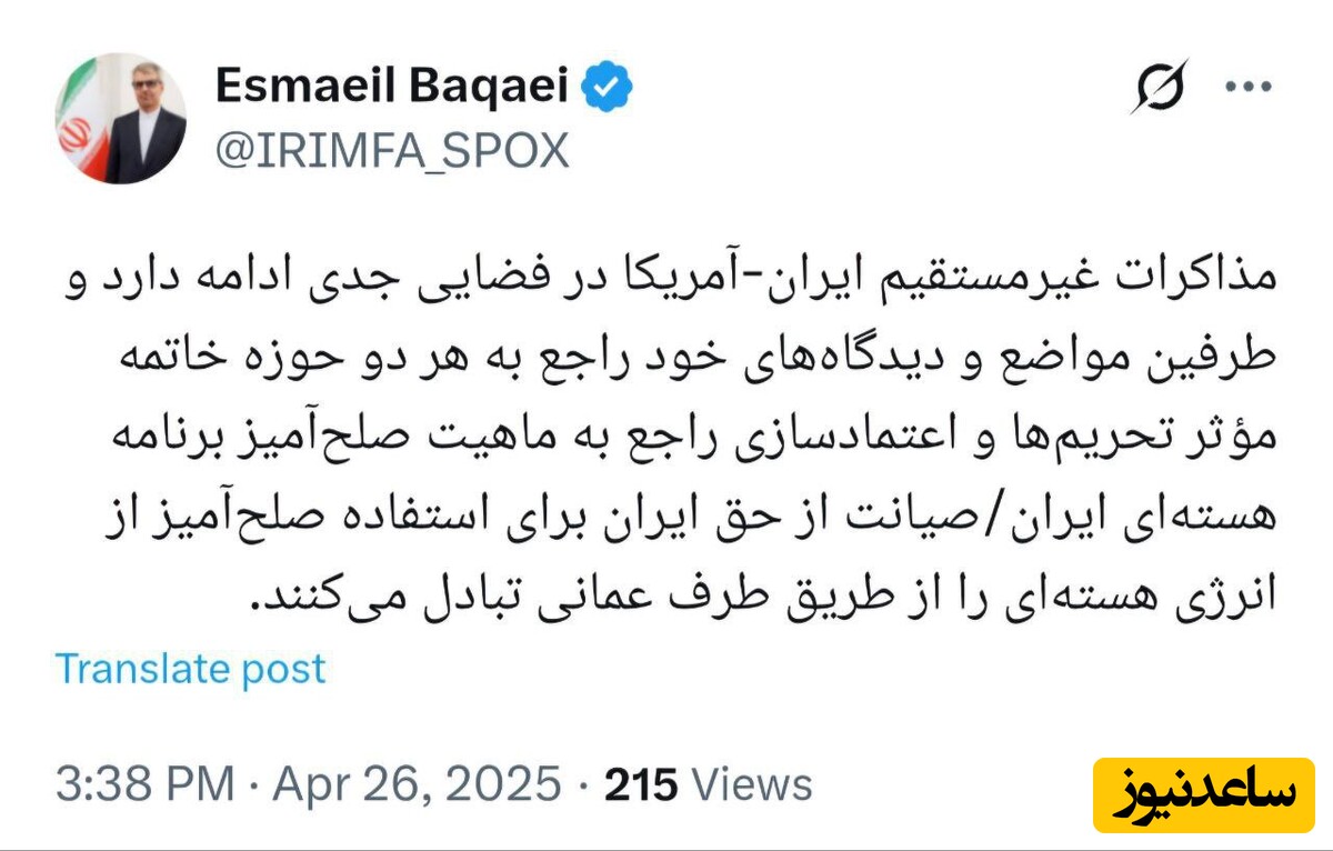 اسماعیل بقائی سخنگوی وزارت امور خارجه در گفتگو با خبرنگاران اعلام کرد: سومین دور مذاکرات غیرمستقیم ایران- آمریکا که از حدود ساعت 10 صبح شروع شده است، به روال دو دور قبلی با تسهیلگری میزبان عمانی و با حضور روسای هیاتهای نمایندگی ایران و آمریکا در سالنهای مجزا در حال انجام است.