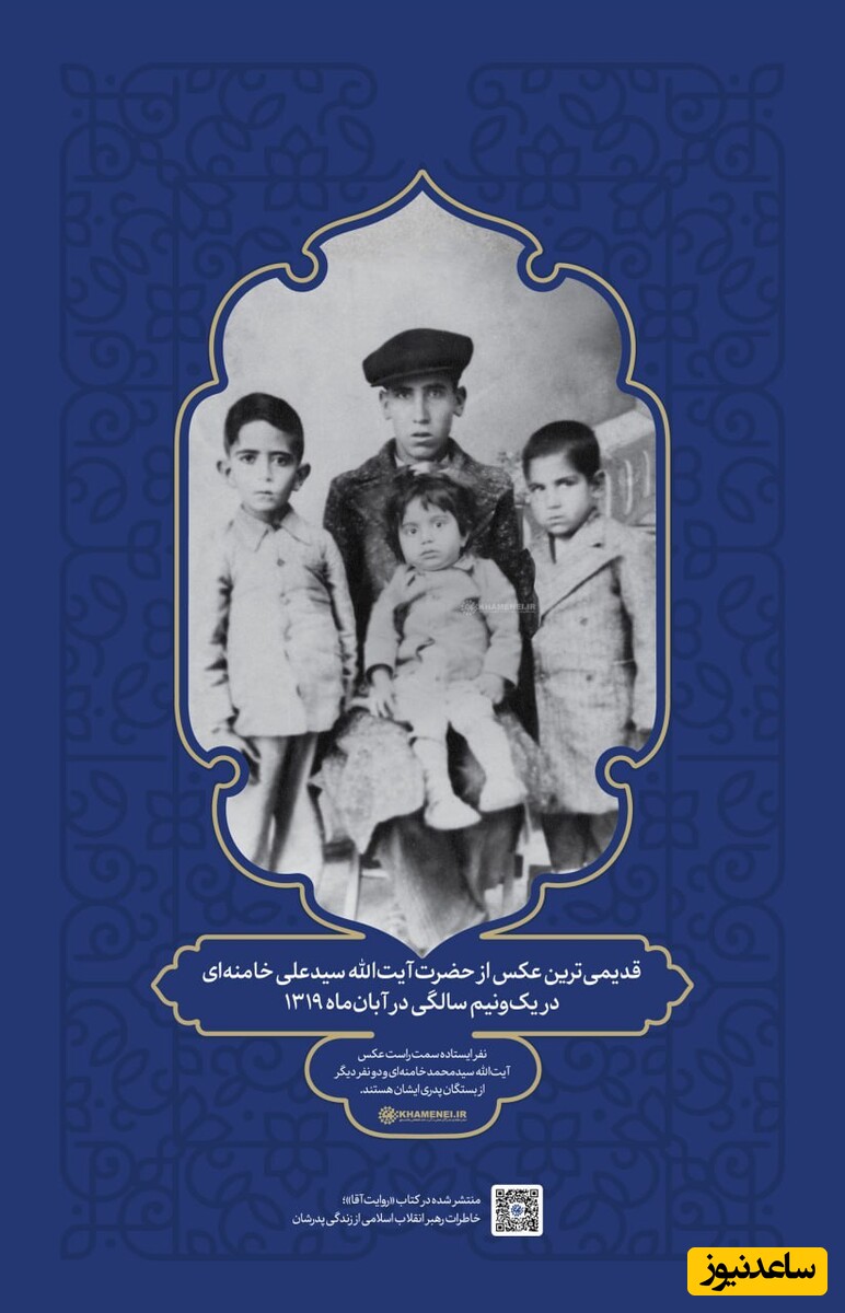 به گزارش سرویس سیاسی پایگاه خبری تحلیلی ساعدنیوز، قدیمیترین تصویر آیتالله خامنهای که آبان 1319 در یکونیم سالگیِ ایشان ثبت شده، بهمناسبت انتشار کتاب «روایت آقا» منتشر شد. کتاب «روایت آقا» روایتی است از زندگی، شخصیت و سلوک علمی و معنوی آیتالله سید جواد خامنهای ـ پدر رهبر معظم انقلاب ـ از زبان فرزند و شاگرد ایشان حضرت آیتالله سیدعلی خامنهای.