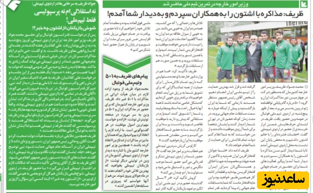 در بیست و هفتم اردیبهشت 93 خبر ورزشی گزارشی اختصاصی از حضور جواد ظریف در اردوی تیم ملی منتشر کرد که بازتاب فراوانی داشت. ظریف در خلال بازدید خود از اردوی تیم ملی به نکته جالبی اشاره کرد و گفت: