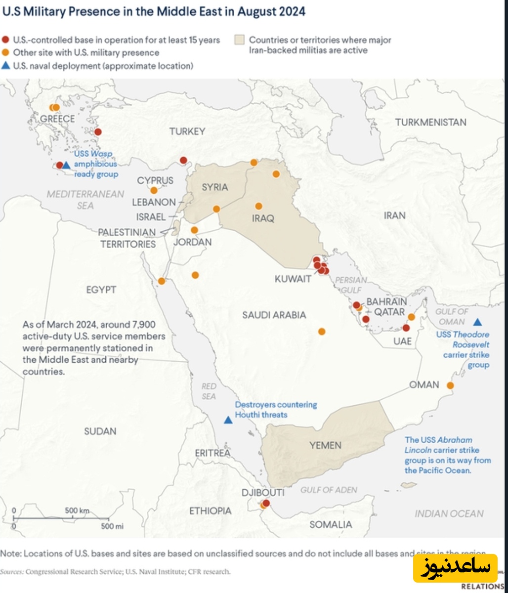 نقشه شورای روابط خارجی (CFR) آمریکا که در ادامه آمده، شامل نقاط استقرار قوای نظامی دریایی، زمینی و هوایی آمریکا در جغرافیایی حدفاصل یونان تا عمان و بر اساس اطلاعات آشکار ترسیم شده است. هدف قرار دادن تمام این پایگاهها، در دسترس ایران است.