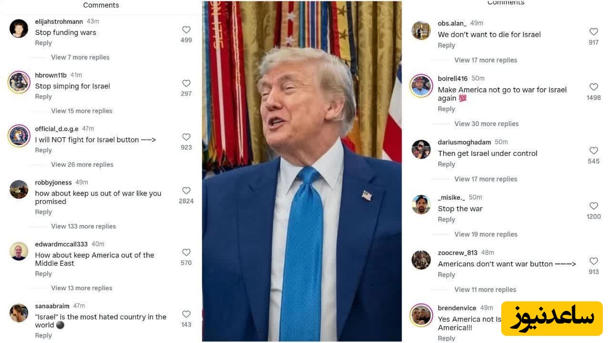 ساعدنیوز: تصویری در فضای مجازی در حال دست به دست شدن است که نشان میدهد مردم آمریکا با ثبت کامنتهایی در پست اینستاگرامی ترامپ از او میخواهند که در جنگ ایران و اسرائیل مداخله نکند.