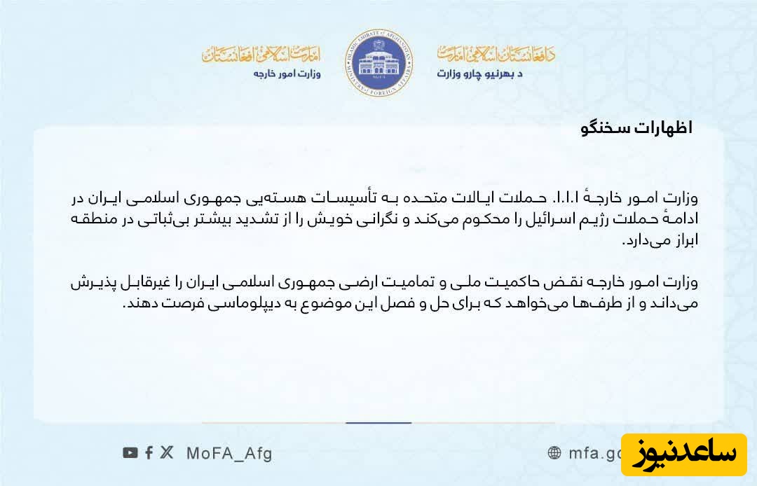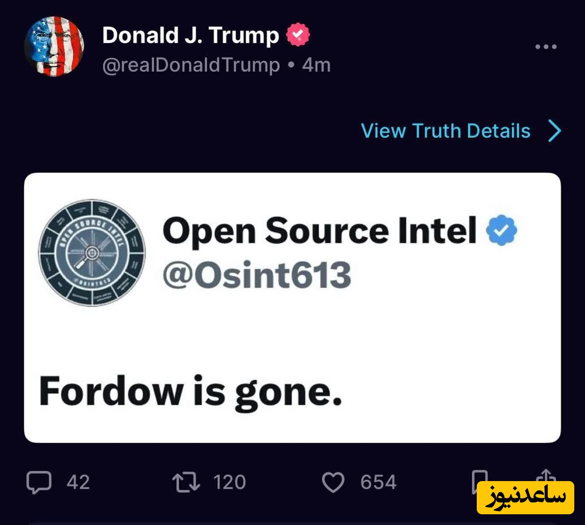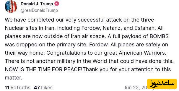 ترامپ: ما حمله بسیار موفقیتآمیز خود را به سه سایت هستهای ایران، شامل فردو، نطنز و اصفهان، تکمیل کردیم. اکنون همه هواپیماها خارج از حریم هوایی ایران هستند. محموله کاملی از بمبها روی سایت اصلی، فردو، ریخته شد. همه هواپیماها به سلامت در راه بازگشت به خانه هستند. به رزمندگان بزرگ آمریکاییمان تبریک میگوییم. هیچ ارتش دیگری در جهان نمیتواند این کار را انجام دهد. اکنون زمان صلح است!