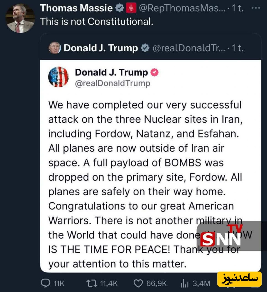 🔹«تصمیم فاجعهبار رئیسجمهور برای بمباران ایران بدون مجوز، نقضی جدی و آشکار از قانون اساسی و اختیارات جنگی کنگره است.