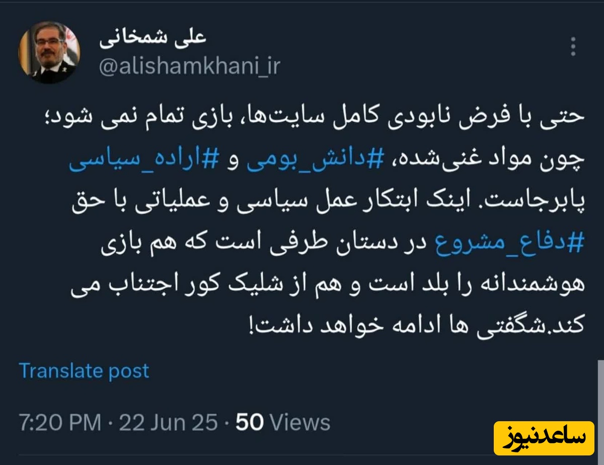 🔹براساس اطلاع دقیق عرض میکنم که برخلاف ادعاهای رئیسجمهور کذاب آمریکا، تاسیسات هستهای فردو آسیب جدی ندیده و عمده آنچه آسیب دیده صرفا روی زمین بوده که قابل احیا است.