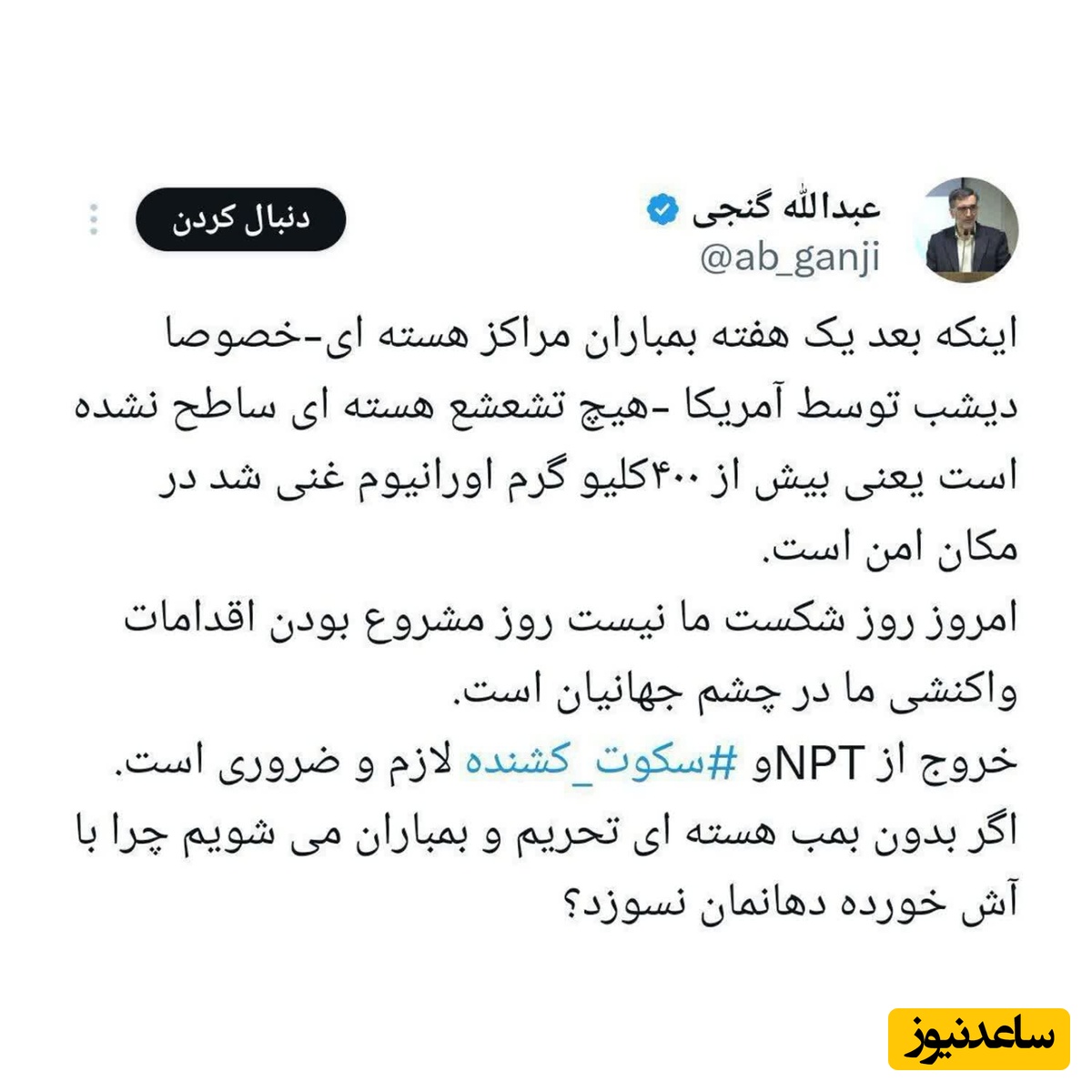 🔹اگر فردو از بین رفته بود، شاهد دهانههای آتشفشانی، گسیختگی الکترومغناطیسی، پرواز اضطراری، روشن شدن لرزهنگارها و شعلههای فروسرخ در زیر کوه بودیم. در عوض، توییتی از یک حساب کاربری در شمال اسرائیل دریافت کردیم که فریاد میزد «فردو از بین رفته است».