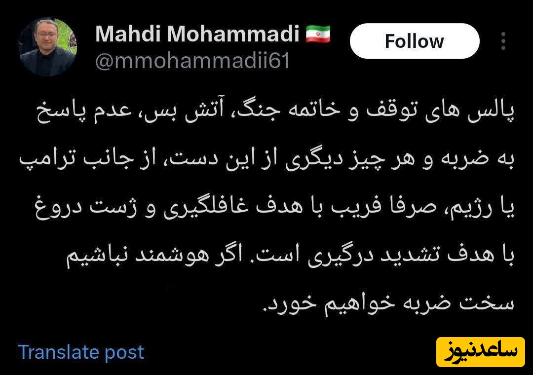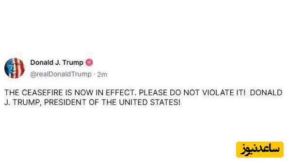 🔺رئیسجمهو فریبکار و دروغگوی آمریکا که تلاش دارد نشان دهد در برقراری آتشبس جدی است با انتشار پیامی در فضای مجازی مدعی شد: