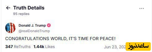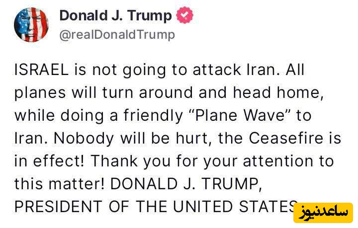 تبریک به همه! اسرائیل و ایران کاملاً توافق کردهاند که یک آتشبس کامل و جامع (تقریباً 6 ساعت دیگر، زمانی که اسرائیل و ایران به پایان ماموریتهای نهایی و در حال انجام خود رسیده باشند!) به مدت 12 ساعت برقرار شود که در آن زمان جنگ پایان یافته تلقی خواهد شد! رسماً، ایران آتشبس را آغاز خواهد کرد و در ساعت 12، اسرائیل آتشبس را آغاز خواهد کرد و در ساعت 24، پایان رسمی جنگ 12 روزه توسط جهانیان مورد ستایش قرار خواهد گرفت. در طول هر آتشبس، طرف مقابل صلحآمیز و محترمانه باقی خواهد ماند. با فرض اینکه همه چیز آنطور که باید پیش برود، که خواهد رفت، مایلم به هر دو کشور، اسرائیل و ایران، به خاطر داشتن استقامت، شجاعت و هوش برای پایان دادن به چیزی که باید «جنگ 12 روزه» نامیده شود، تبریک بگویم. این جنگی است که میتوانست سالها ادامه یابد و کل خاورمیانه را نابود کند، اما این اتفاق نیفتاد و هرگز هم نخواهد افتاد! خدا اسرائیل را حفظ کند، خدا ایران را حفظ کند، خدا خاورمیانه را حفظ کند، خدا ایالات متحده آمریکا را حفظ کند، و خدا جهان را حفظ کند!
