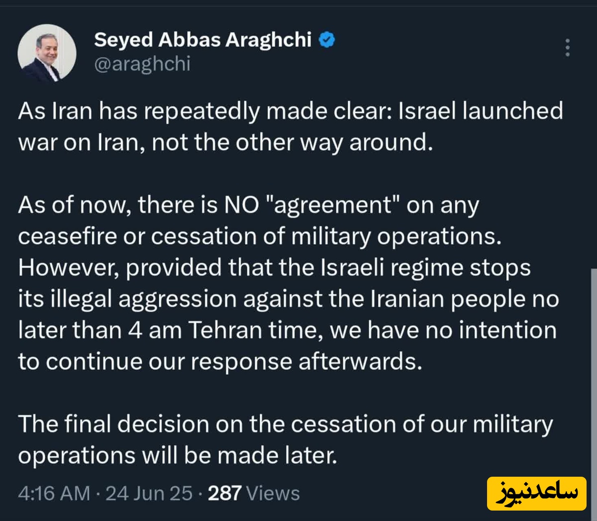 🔹در حال حاضر توافقی در موضوع آتشبس یا توقف عملیات وجود ندارد. با این حال به شرط آنکه رژیم اسرائیل تهاجم غیرقانونی خود علیه مردم ایران را تا ساعت 4 صبح امروز متوقف کند، ما نیز قصدی برای ادامه پاسخ نداریم.