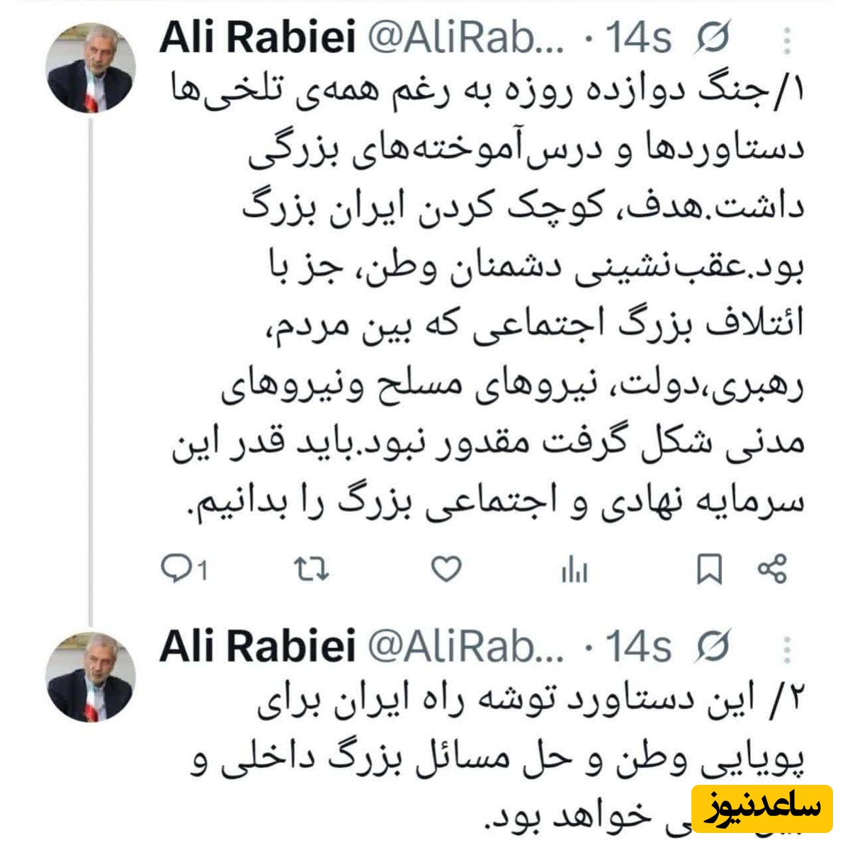 🔹یک هدف اساسی از اعلام یکجانبه خبر آتش بس، تلاش برای ایجاد شکاف در جامعهٔ ایران است.