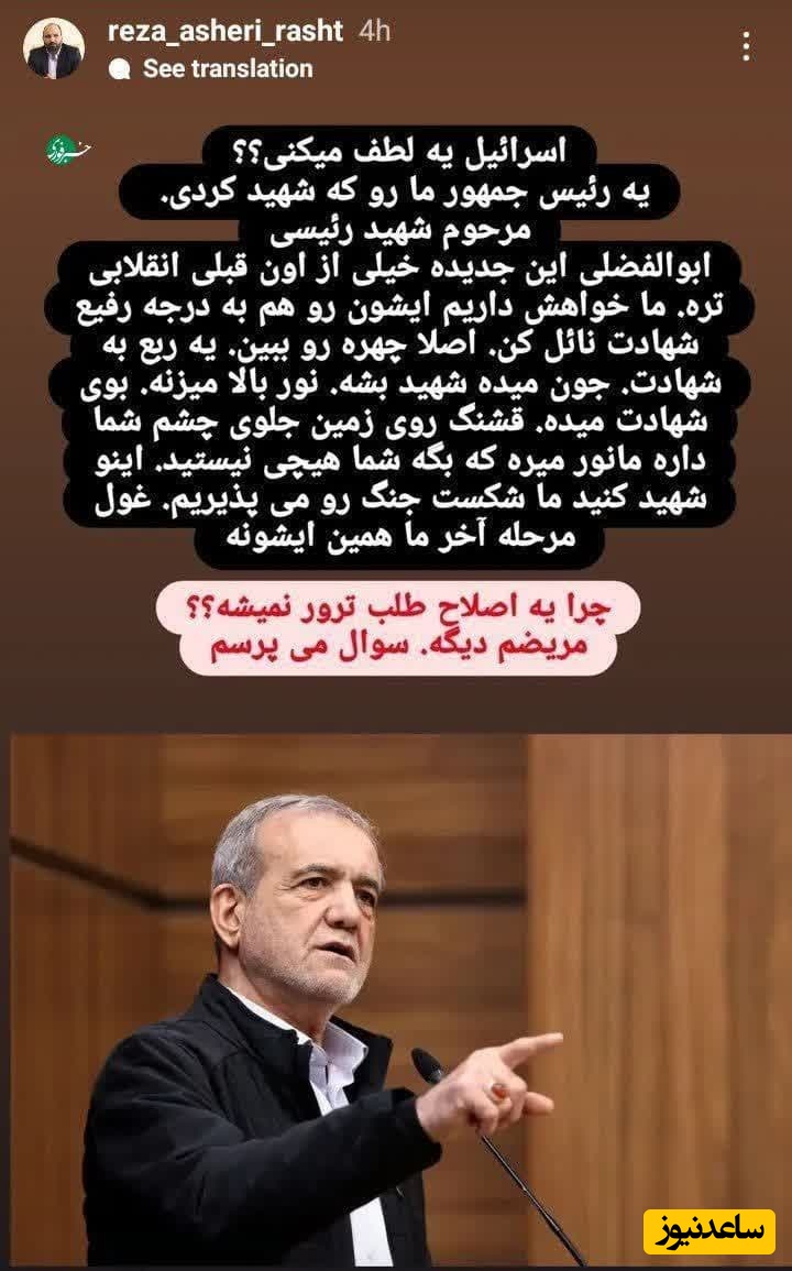 به گزارش سرویس سیاسی پایگاه خبری تحلیلی ساعدنیوز، رضا عاشری، عضو شورای شهر رشت، در اقدامی عجیب، با انتشار یک استوری در اینستاگرام، از اسرائیل، درخواست کرده است برای ترور مسعود پزشکیان رئیس جمهور اقدام کند!