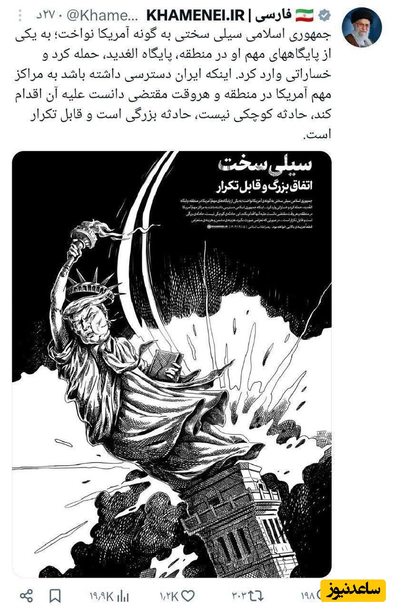 به گزارش سرویس سیاسی پایگاه خبری تحلیلی ساعدنیوز، اکانت توئیتری دفتر مقام معظم رهبری در شبکه ایکس، طرحی معنادار از چهره سیلی خورده ترامپ، در ارتباط با حمله به پایگاه العدیده آمریکا نوشت: جمهوری اسلامی سیلی سختی به گونه آمریکا نواخت؛ به یکی از پایگاههای مهم آمریکا در منطقه، پایگاه العُدید، حمله کرد و خساراتی وارد کرد. اینکه ایران دسترسی داشته باشد به مراکز مهم آمریکا در منطقه و هروقت مقتضی دانست علیه آن اقدام کند، حادثه کوچکی نیست، حادثه بزرگی است و قابل تکرار است.