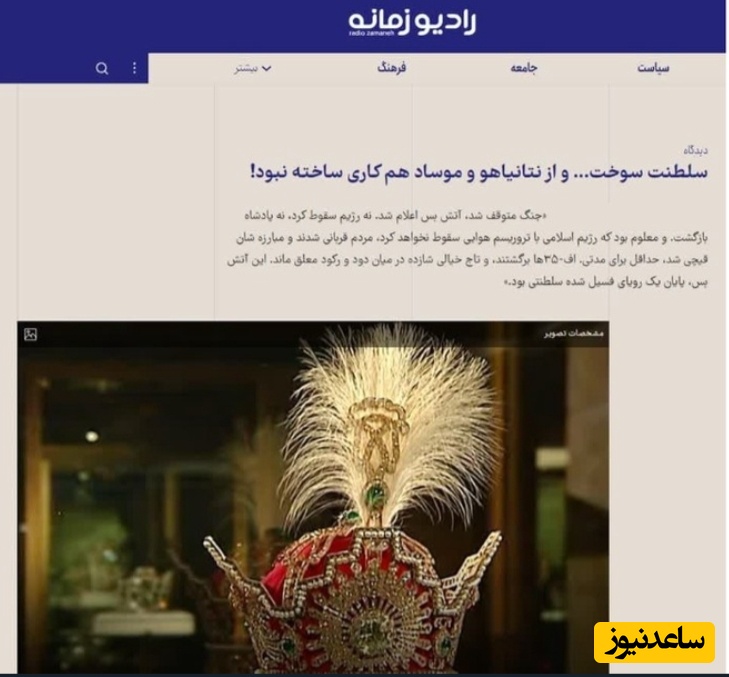 به گزارش سرویس سیاسی پایگاه خبری ساعدنیوز به نقل از فارس، رادیو زمانه، رسانه فارسی زبان وابسته به سرویس اطلاعاتی هلند و وزارت خارجه آمریکا در مطلبی با عنوان «سلطنت سوخت...و از نتانیاهو و موساد هم کاری ساخته نبود!» نوشت:«جنگ متوقف شد، آتش بس اعلام شد. نه حکومت ایران سقوط کرد، نه پادشاه بازگشت و معلوم بود که حکومت ایران با تروریسم هوایی سقوط نخواهد کرد.»