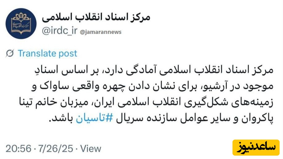 به گزارش سرویس سیاسی پایگاه خبری ساعدنیوز، مرکز اسناد انقلاب اسلامی اعلام کرد: مرکز اسناد انقلاب اسلامی آمادگی دارد، بر اساس اسنادِ موجود در آرشیو، برای نشان دادن چهره واقعی ساواک و زمینههای شکلگیری انقلاب اسلامی ایران، میزبان خانم تینا پاکروان و سایر عوامل سازنده سریال تاسیان باشد.