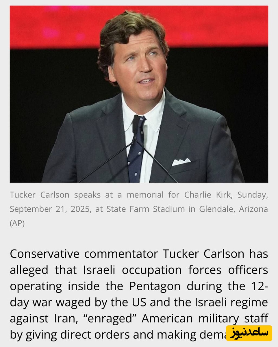 به گزارش سرویس سیاسی پایگاه خبری ساعدنیوز ، کارلسون، مجری جنجالی آمریکایی، در پادکست تازهاش ضمن اشاره به حضور تحقیرکننده افسران ارتش اسراییل در پنتاگون و در جنگ 12 روزه، میگوید: نفوذ اسراییل در ساختارهای نظامی آمریکا به سطحی بیسابقه رسیده است.