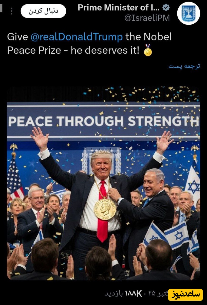 ساعدنیوز: صفحه رسمی نخستوزیر اسرائیل: ترامپ شایسته صلح نوبل است!