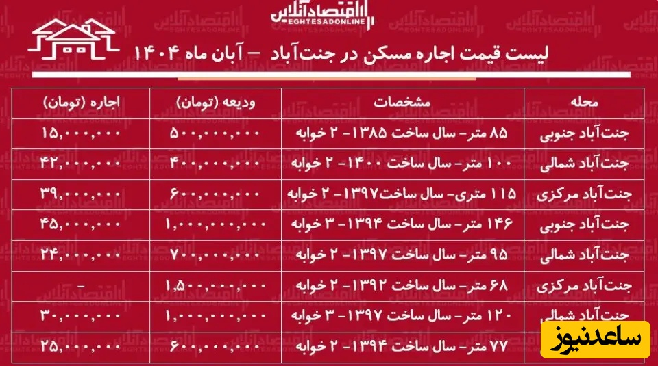 بررسی بازار مسکن جنتآباد در آبان ماه نشان میدهد اجاره یک واحد مسکونی 95 متری دوخوابه در جنتآباد شمالی به 700 میلیون تومان پولپیش و کرایه ماهانه 24 میلیون تومان احتیاج دارد.