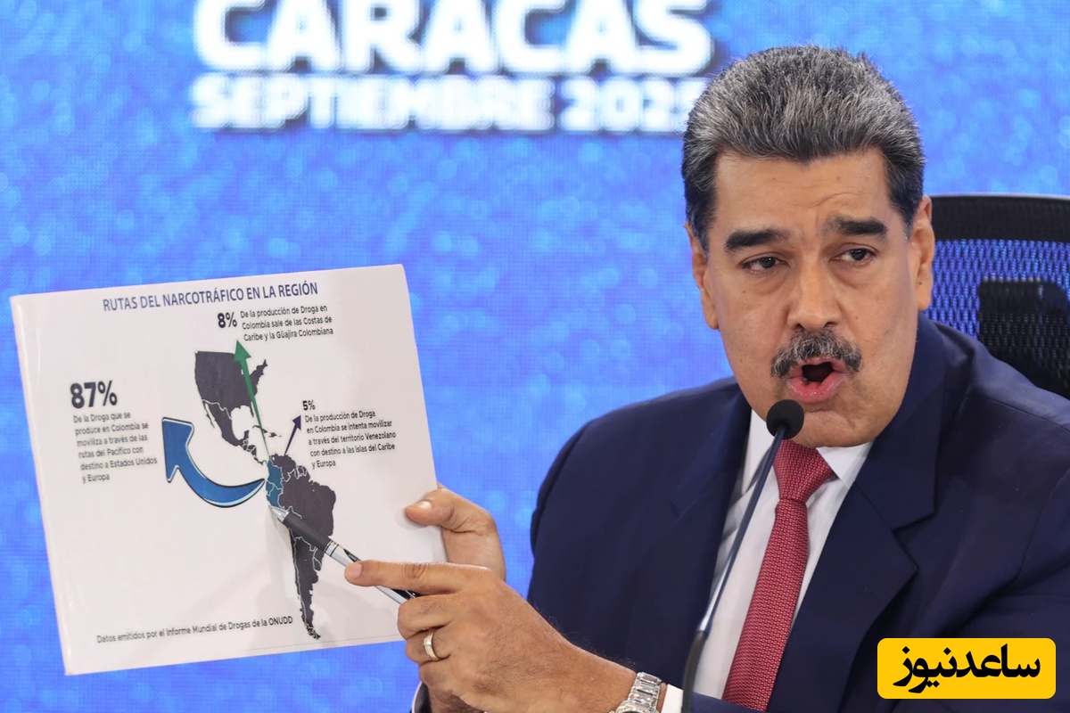 رئیسجمهور ونزوئلا، نیکولاس مادورو، در جریان یک کنفرانس خبری در کاراکاس، ونزوئلا، 15 سپتامبر 2025، به نقشهٔ قارهٔ آمریکا اشاره میکند. (عکس از آسوشیتدپرس /خسوس وارگاس)