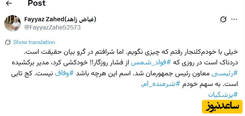 خیلی با خودمکلنجار رفتم که چیزی نگویم. اما شرافتم در گرو بیان حقیقت است. دردناک است در روزی که فواد شمس از فشار روزگار!! خودکشی کرد، مدیر برکشیده رئیسی معاون رئیس جمهورمان شد. اسم این هرچه باشد وفاق نیست. کج تابی است. به سهم خودم شرمندهام.