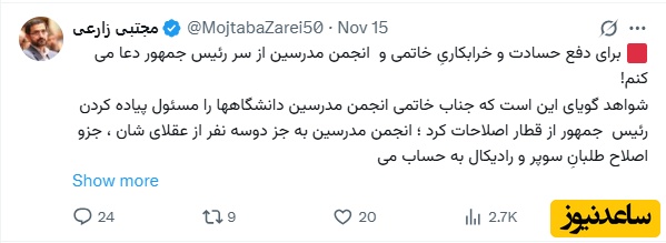 به گزارش سرویس سیاست پایگاه خبری ساعدنیوز، مجتبی زارعی نماینده تهران در مجلس شورای اسلامی: برای دفع حسادت و خرابکاریِ خاتمی و انجمن مدرسین از سر رئیس جمهور دعا می کنم! شواهد گویای این است که جناب خاتمی انجمن مدرسین دانشگاهها را مسئول پیاده کردن رئیس جمهور از قطار اصلاحات کرد ؛ انجمن مدرسین به جز دوسه نفر از عقلای شان ، جزو اصلاح طلبانِ سوپر و رادیکال به حساب می آیند ؛ حالا خاتمی به نشست شان پیام خاصی داد ؛ به نظر من پیام خاتمی دو بعد نظری و عملی دارد ؛ در بعد نظری خاتمی در نامه، از پزشکیان عبور کرد آنجا که او را دعوت به پس گرفتن حقوق و صلاحیت دولت از نظام می کند اما این حرف خطرناک را با عبارت اینکه به دولت پزشکیان باید کمک کرد در بین سطور مخفی کرده است ؛ البته جناب خاتمی یک حسادت تاریخی راهبردی به دکتر پزشکیان رئیس جمهور محترم هم دارد ؛ پزشکیان با بی اعتنایی به شعارهای رایج خاتمی و اصلاح طلبانِ سوپر که دولت ایده آل شان مبتنی بر اصلاحاتِ لیبرال سکولار است ، بر وامداری خود به فلسفه سیاسی برآمده از نهج البلاغه و قوانین منبعث از نظام سیاسی جمهوری اسلامی و سیاست های کلی ابلاغی امام خامنه ای تآکید داشته و دارد؛ چیزی که در دولت اصلاحاتِ لیبرال سکولار خاتمی و دولت تکنوکرات لیبرال جناب روحانی در قالب حاکمیتِ دوگانه تجسّم و تمثُّل می یافت یعنی در عین حال که در قوه ی مجریه حضور داشتند ژست اپوزسیونی هم می گرفتند؛ در حالیکه ساختار در جمهوری اسلامی غیر قابل عبور است ؛ و صد البته هم صورت مهم است و هم سیرت و عبور از هر دوی شان نا ممکن است ؛ حالا خاتمی که در دولت دومش خود به شکار اصلاح طلبانِ سوپر تبدیل شده بود و ساختار شکنانِ این اردوگاه میل داشتند او را از قطار اصلاحات پیاده و دست آخر هم با پرتاب کفش به سوی وی، از خجالتش هم در آمدند اینک ( خاتمی )می خواهد پزشکیان را که می گوید من "اصلاح طلبِ اصولگرا " هستم را به سرنوشت بغرنج خود دچار کند؛ خاتمی از اینکه پزشکیان ساختار را خط قرمزش معرفی می کند ناراحت است ؛ از سوی دیگر ، پزشکیان و نخبگان سیاسی و مطلعین می دانند خاتمی برای پیروزی پزشکیان منشاء اثر جدّی ای نبود و به جز صدور بیانیه ای موافقت آمیز تلاشی از خود بخرج نداده بود گو اینکه در آنالیز کمّیِ آرا نیز همه متوجه شدند که خاتمی در کشانیدن مردم به انتخابات چهاردهمین دوره ریاست جمهوری نقشی بسیار ضعیف از حیث وزن کشی از خود در سپهر عمومی برجای گذاشت ؛ اینک صرفنطر از اینکه من چه نظری در باره رئیس جمهور دارم اما بخاطر شرایط حساس ایران در جنگ 12 روزه و جنگ آینده با اسراییل و کارهایی که از نظر اقتصادی _ اجتماعی روی زمین است نگرانم که پزشکیان برای خود بسندگی ایدئولوژیک و تمسّکش به فلسفه سیاسی نهج البلاغه و بی اعتنایی اش به فلسفه ی سیاسی غرب مورد حسادت خاتمی و متعاقبا مورد ضربه و خرابکاری افراد رادیکال انجمن مدرسین قرار گیرد که به همین جهت برای دفع این حسادت و خرابکاری ها از سر رئیس جمهورِ وطن خواه به سهم خود دعا می کنم ولو اینکه از نظر عملکرد و کارنامه با پزشکیان موافق یا مخالف باشیم ؛ در پایان از حق نگذریم فقط یک جای نامه خاتمی به انجمن مدرسین خوب بود؛ آنگاه که علیه اسراییلِ آدمخوار و آمریکای متجاوز در جنگ علیه جمهوری اسلامی موضع گیری کرد اما مجددا می گویم دعوت خاتمی از پزشکیان برای باز پس گیریِ موهومِ حقِ دولت تحریک رئیس جمهور علیه ساختار نظام و ایجاد جبهه ای جدید علیه وحدت ملی و قویا محکوم است ؛