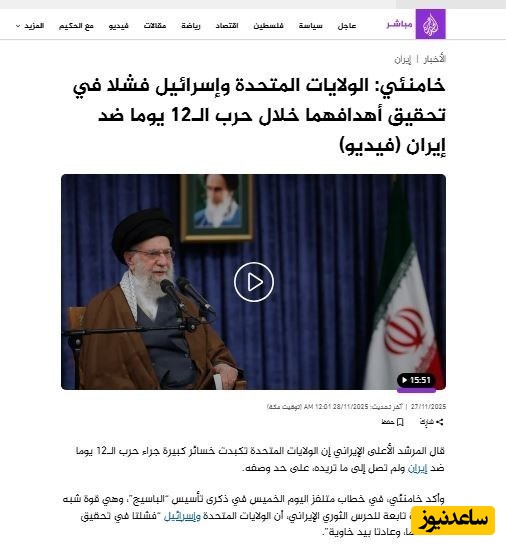 شبکه خبری قطری الجزیره مباشر ضمن بازتاب گسترده سخنان رهبر انقلاب از قول ایشان تیتر زد که آمریکا و اسرائیل در تحقق اهدافشان در جنگ 12 روز علیه ایران شکست خوردند .