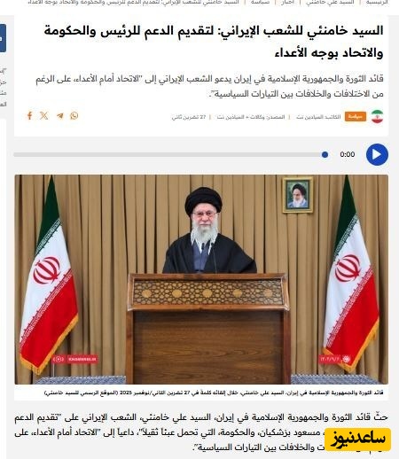به گزارش سرویس سیاست پایگاه خبری ساعدنیوز، حضرت آیتالله خامنهای رهبر معظم انقلاب اسلامی دیشب در سخنرانی تلویزیونی خود خطاب به ملت عزیز ایران، با تاکید بر ضرورت تقویت و استمرار قدرتمندانه بسیج در نسلهای بعدی بهعنوان «یک ثروت بزرگ، حرکت همگانی و عامل افزایش قدرت ملی»، ناکامی آمریکا و رژیم صهیونیستی را در تحقق هیچ یک از اهداف حمله به ایران، نشانه شکست بدون تردید آنها خواندند و با بیان چند توصیه به ملت، همه مردم و جناحهای سیاسی را به حفظ و تقویت اتحاد ملی فراخواندند.