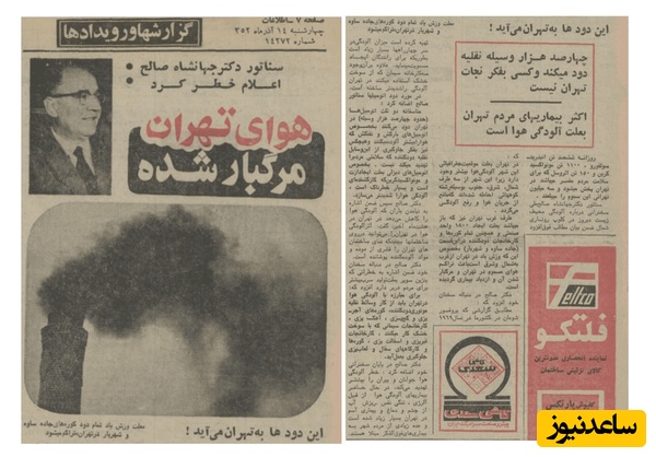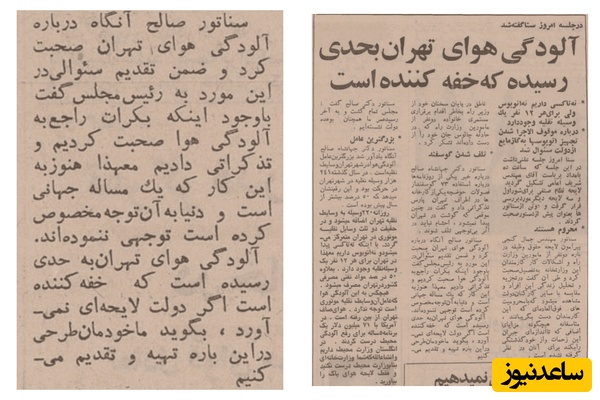 روزنامه اطلاعات در 20 اردیبهشت 1350، نوشته است: «آلودگی هوای تهران به حدی رسیده که خفهکننده است».در گزارش این روزنامه ـ که به یکی از جلسات مجلس سنا در دوره پهلوی پرداخته ـ آمده است: «سناتور صالح آنگاه درباره آلودگی هوای تهران صحبت کرد و... گفت با وجود اینکه به کرّات راجعبه آلودگی هوا صحبت کردیم و تذکراتی دادیم، معهذا هنوز به این کار که یک مسأله جهانی است و دنیا به آن توجه مخصوص کرده است، توجهی ننمودهاند. آلودگی هوای تهران به حدی رسیده است که خفهکننده است». (روزنامه اطلاعات، 20 اردیبهشت 1350، صفحه 4.)