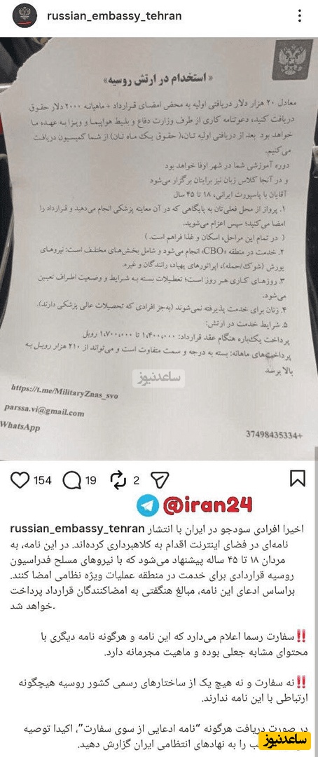 سفارت روسیه در ایران آگهی ادعایی منتسب به این مکان دیپلماتیک را تکذیب کرد. سفارت روسیه در تهران روز سهشنبه و در اطلاعیهای اعلام کرد: اخیرا افرادی سودجو در ایران با انتشار نامهای در فضای اینترنت اقدام به کلاهبرداری کردهاند. در این نامه، به مردان 18 تا 45 ساله پیشنهاد میشود که با نیروهای مسلح فدراسیون روسیه قراردادی برای خدمت در منطقه عملیات ویژه نظامی امضا کنند. براساس ادعای این نامه، مبالغ هنگفتی به امضاکنندگان قرارداد پرداخت خواهد شد. طبق این اطلاعیه سفارت روسیه «رسما اعلام میدارد که این نامه و هرگونه نامه دیگری با محتوای مشابه جعلی بوده و ماهیت مجرمانه دارد. نه سفارت و نه هیچ یک از ساختارهای رسمی کشور روسیه هیچگونه ارتباطی با این نامه ندارند.» سفارت روسیه اعلام کرده است: در صورت دریافت هرگونه «نامه ادعایی از سوی سفارت»، اکیدا توصیه میشود مراتب را به نهادهای انتظامی ایران گزارش دهید.