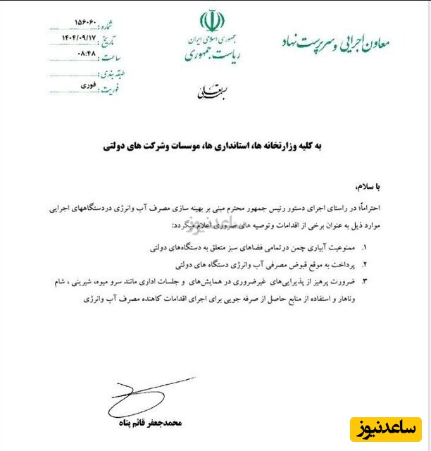 به گزارش سرویس سیاست پایگاه خبری ساعدنیوز، متن بخشنامه بهینهسازی مصرف آب و انرژی که با امضای محمدجعفر قائمپناه معاون اجرایی رئیسجمهوری به دستگاههای اجرایی ابلاغ شد.