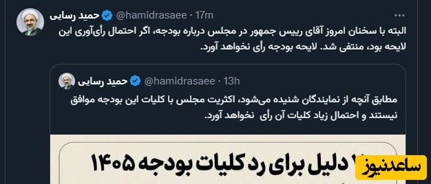 به گزارش سرویس سیاست پایگاه خبری ساعدنیوز، حمید رسایی نماینده تهران در مجلس، در توئیتی نوشته بود: «مطابق آنچه از نمایندگان شنیده میشود، اکثریت مجلس با کلیات این بودجه موافق نیستند و احتمال زیاد کلیات آن رأی نخواهد آورد.»