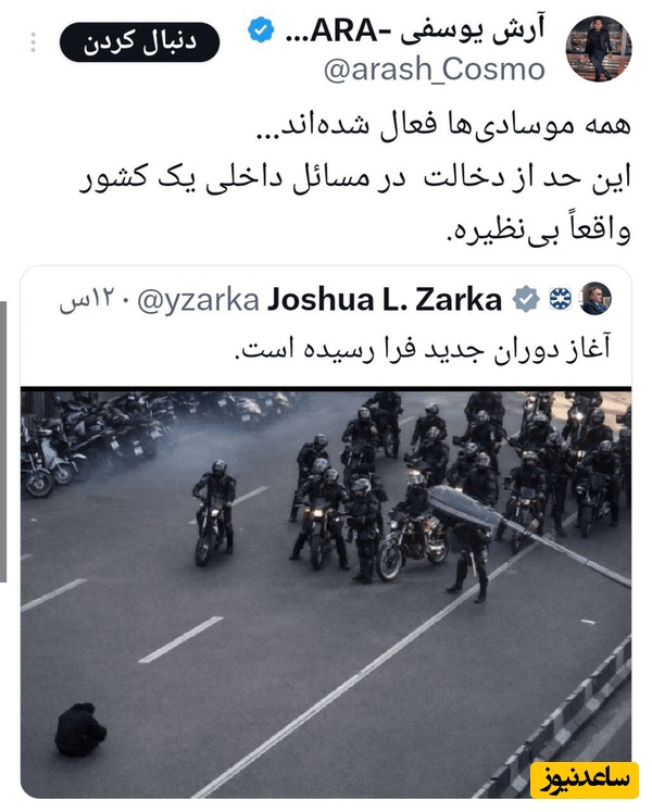 همچنین صهیونیستهایی که به فارسی در شبکههای اجتماعی فعالیت میکنند حمایت خود را از ایجاد اغتشاشات به نفع سلطنتطلبان به صورت صریح ابراز داشتهاند.