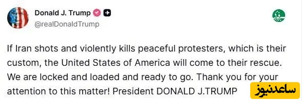 به گزارش سرویس سیاست پایگاه خبری ساعدنیوز، به نقل از فارس، در راستای حمایت عوامل خارجی از اغتشاشات در ایران، دونالد ترامپ رئیس جمهور آمریکا هم خیلی زود وارد معرکه شد و از آشوب و اغتشاش در داخل ایران حمایت کرد.ترامپ در پستی در شبکه اجتماعی تروث سوشال نوشت، ترامپ: «اگر ایران به روی معترضان مسالمتآمیز شلیک کند و آنها را بهطور خشونتآمیز بکشد ایالات متحده آمریکا به کمک آنها خواهد آمد. ما کاملا برای اقدام آمادهایم...»